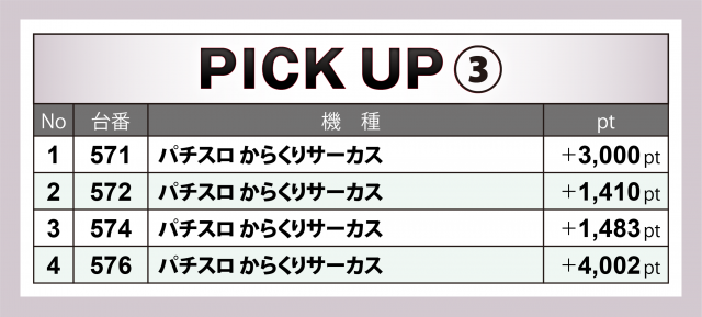設置少なめの『パチスロ からくりサーカス』6台では全体の8割超となる5台がプラスとなり、1,000overは4台、+4千超&+3千ピッタリが1台ずつ輩出された。