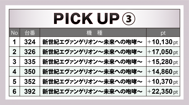 店内最多の設置を誇る『新世紀エヴァンゲリオン〜未来への咆哮〜』43台も好況。プラス台の割合は約40%(17台)と少なめだったが、6台が+1万超の差玉をマーク、シマトップの392番台が+2万2千超となった。