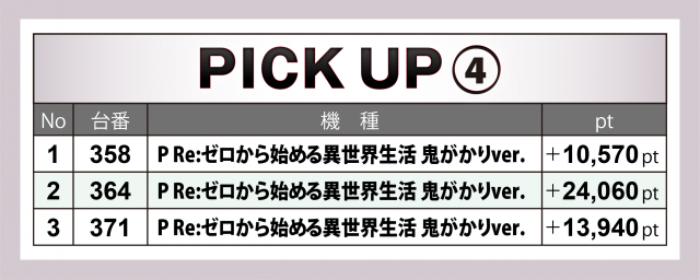 根強い人気となる『P Re:ゼロから始める異世界生活 鬼がかりver.』21台も負けていない。プラス率は約48%(10台)と半数弱、最優秀となったのは364番台の+2万4千超だった。