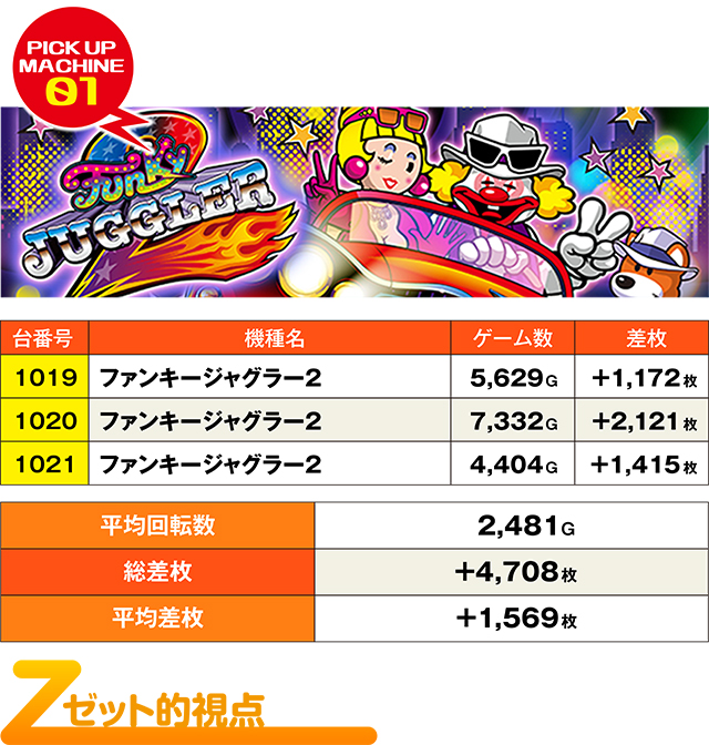 負けじと『アイムジャグラーEX』も大奮闘!3台並びで3台ともが+1,500枚オーバーの快挙を達成し、その平均は+1,902枚をマークした。