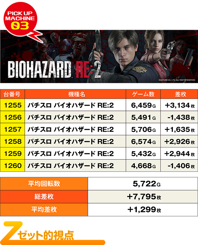 6台設置の『パチスロ バイオハザード RE:2』からは6台並びで優秀台の挙動を確認。2台がマイナスで終わってしまったものの、全台系の可能性が濃厚…!?