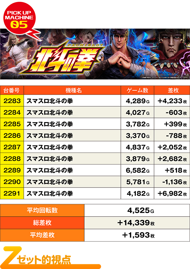 『スマスロ北斗の拳』からも景気のいい結果が続々と生まれていた。9台並びのブロックの中で約半数の4台が+2,000枚超えを達成。2291番台に至っては7,000枚に迫る好レコード!