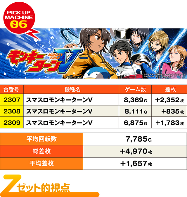 こちらも全台系の可能性を秘めた『スマスロモンキーターンV』。3台ともがプラス差枚をマークしており、その平均は+1,657枚と納得のいく数値となっていた。