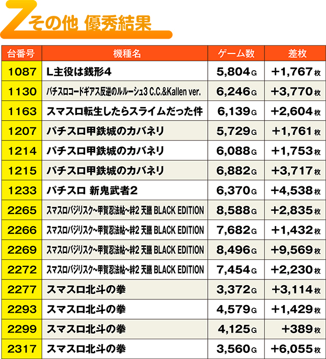 並びだけではなく、単品でも優秀台が数多く存在していたと見て間違いないだろう。実際、人気マシンから優秀台ならではの好結果が多数生まれていた。中でも目を引いたのは9,500枚オーバーという突出した結果を叩き出した『スマスロバジリスク~甲賀忍法帖~絆2 天膳 BLACK EDITION』である。