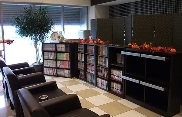 マンガ本や雑誌などが用意されている休憩コーナーは落ち着いた雰囲気となっており、休憩中や空き台を待つ時間も楽しく過ごせると思えた。