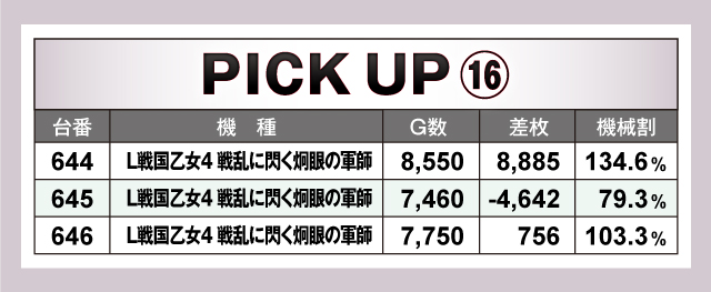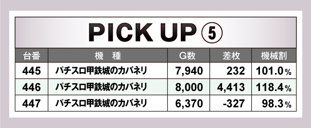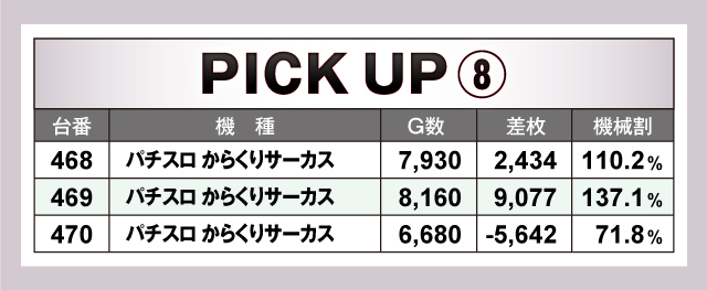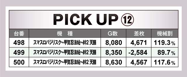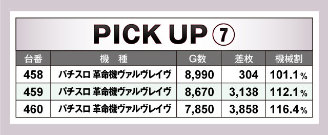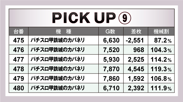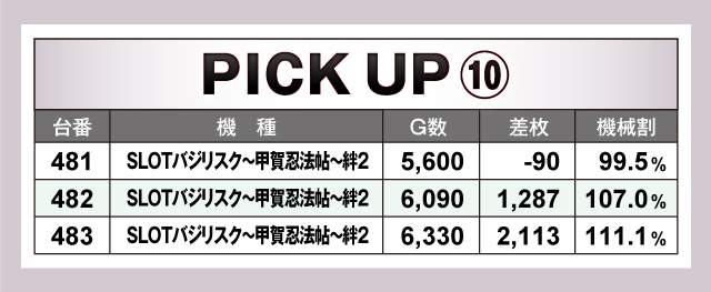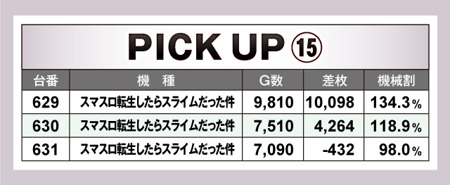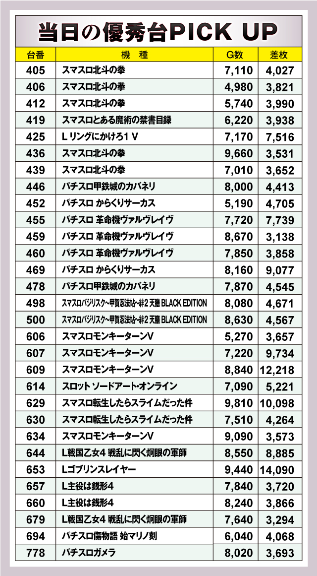 まずは優秀台30台のピックアップから。30台全台が+3,000枚オーバーで、+5,000枚オーバーは9台。そして+10,000枚オーバーが3台出現するほどの盛り上がりぶり! そのなかで最も活躍した優秀台は、653番台の「Lゴブリンスレイヤー」で、差枚+14,090枚を獲得! ランクイン台を見渡すと、スマスロがやはり圧倒的で、全体の9割以上がランクイン。その他としては、「パチスロ甲鉄城のカバネリ」や「パチスロガメラ」などがランクインしていた!
