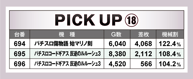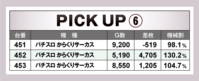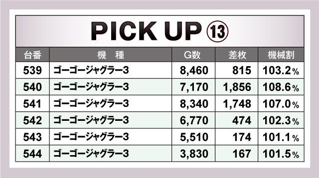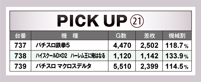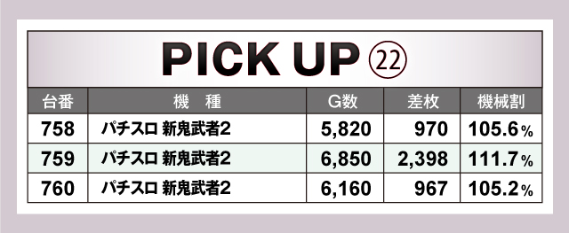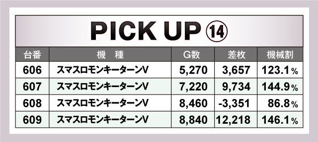 続いては3台以上の並びで活躍していた22箇所を紹介していこう。なんと22箇所全ての並びがトータルプラス終了で、そのうち9箇所が平均+2,000枚オーバー! なかでも606番台〜609番台の「スマスロモンキーターンV」の4台並びは、3/4台がプラスの平均+5,565枚と圧倒的な結果をマーク! その他並びもかなり優秀な成績を残していた!