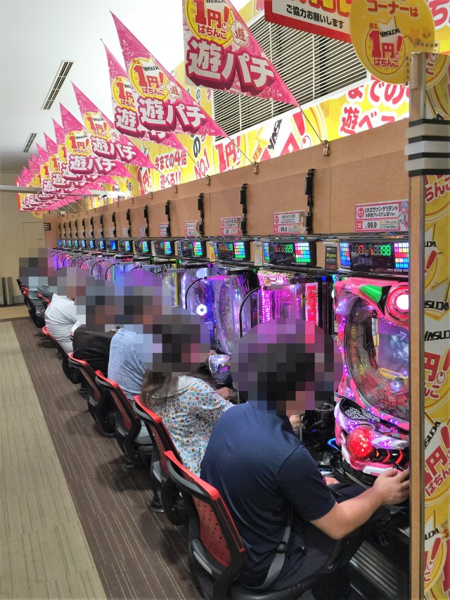 1円パチンコもにぎやかな状況。「CRヱヴァンゲリヲン9 8号機プレミアム甘Ver.」や「CRAルパン三世 I’m a Super hero不二子におまかせ」などの遊パチコーナーが人気で、プレイヤーたちで賑わう様子が広がっていた。
