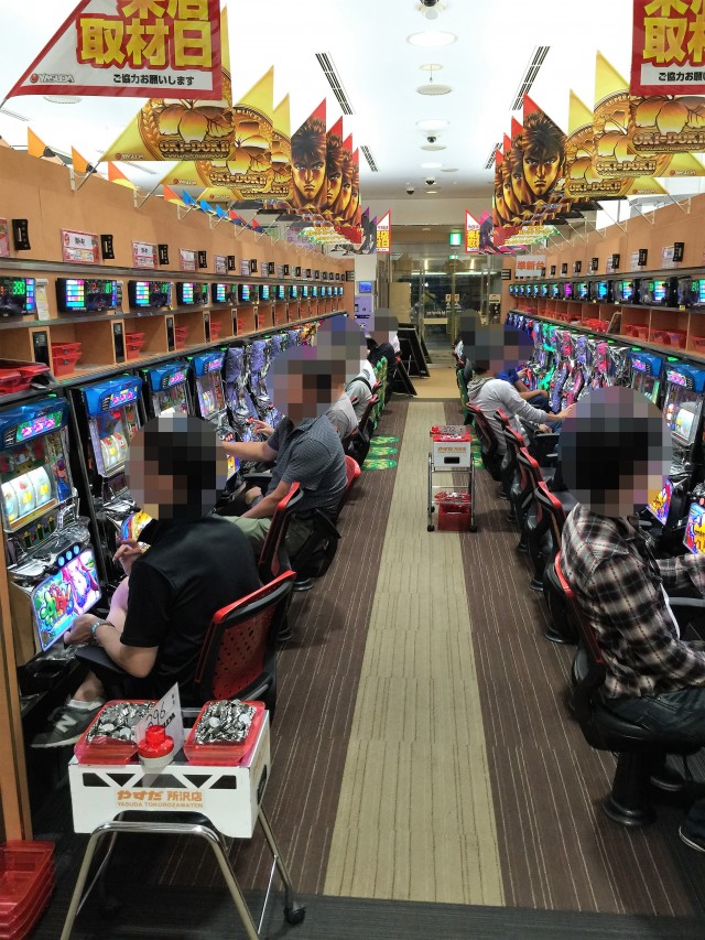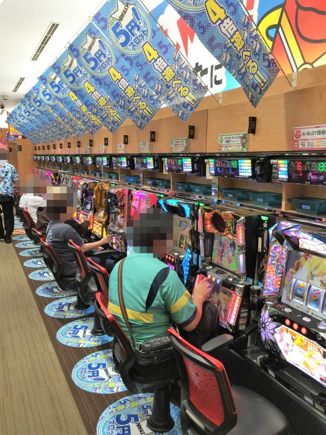 20円スロットコーナーで、とくに盛り上がっていたのはAタイプ。「沖ドキ!」が人気で、なかには台の性能を引き出し注目を浴びるプレイヤーの姿もあった。