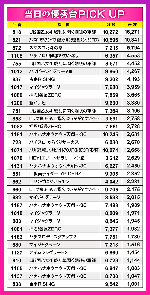 8台すべてがプラス、というわけにはいかなかったものの、この日の首位記録である16,271枚を皮切りに、3,000枚オーバー記録が計3台とまずまずの結果に。