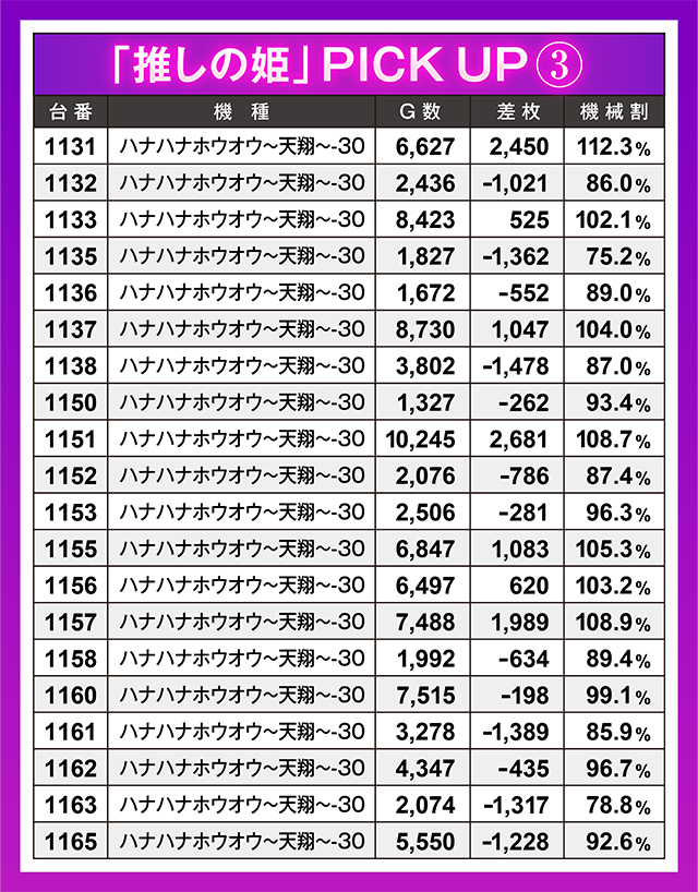 圧巻の20台並びを披露したのは『ハナハナホウオウ~天翔~-30』。総回転数の足りていない台にマイナス台があるものの、こちらも全台系のニオイがプンプン…!?