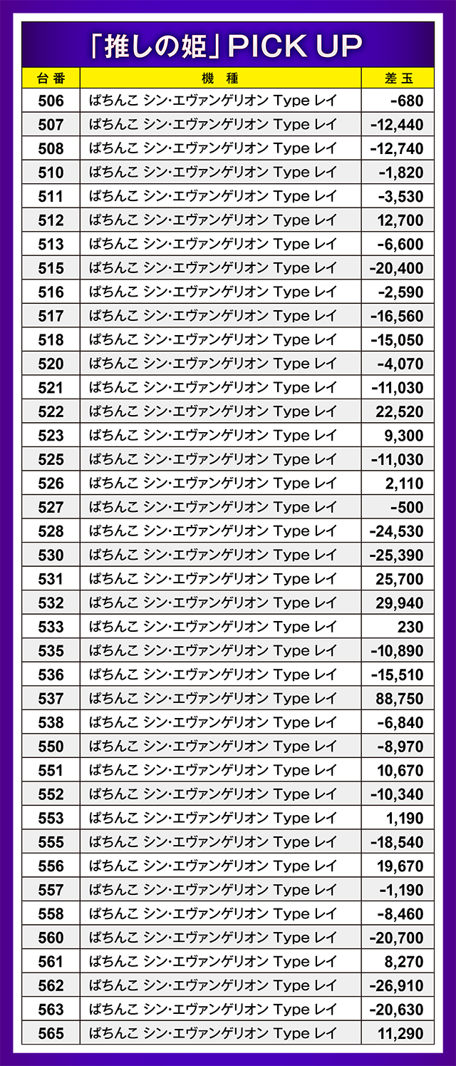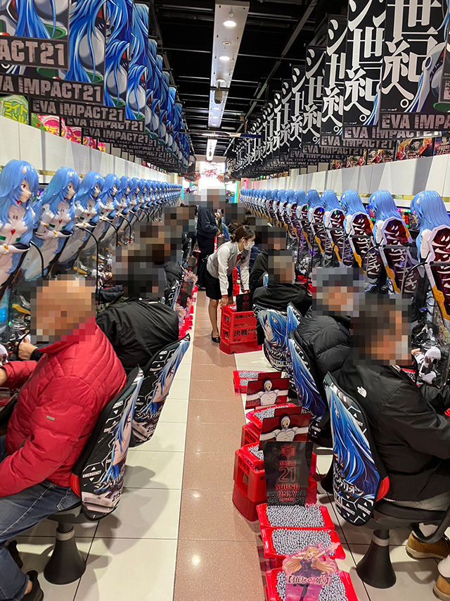 前回に続き、この日も『ぱちんこ シン・エヴァンゲリオン Type レイ』コーナーがかなり好環境だった様子。しかしそれが結果に反映されないのがパチンコの悲しいところ。88,750玉というハイパーレコードが生まれた反面、マイナス台も目立ってしまった。
