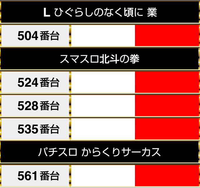 『L ひぐらしのなく頃に 業』の504番台や『パチスロ からくりサーカス』の561番台などもプラスptとなった。