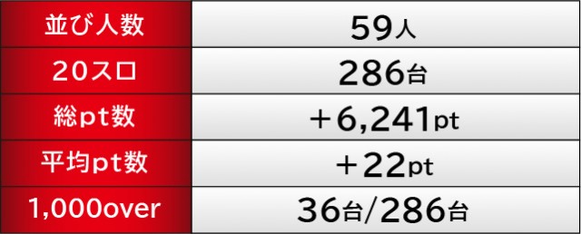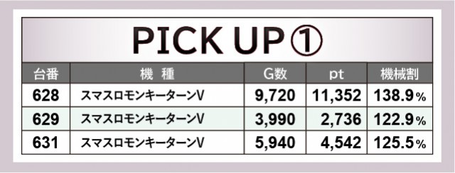 人気機種『スマスロモンキーターンV』は全台が高い活気を披露しており、その内3台が大きな熱量を放っていた。628番台+11,352ptは特に鮮烈な記録となっており、631番台+4,542ptも追随するように熱を帯びていたことから、島は大きく盛り上がっていたと言える。今後も同等以上の内容が予想できることから、同機種の動向から目が離せそうにない。