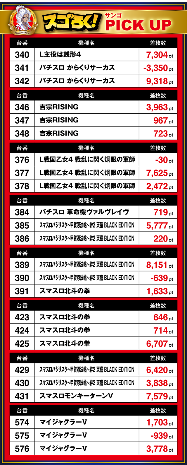 389番台と390番台の「スマスロバジリスク~甲賀忍法帖~絆2 天膳 BLACK EDITION」からも優秀台の兆しが感じられ、最終的には389番台が8,000ptオーバー。