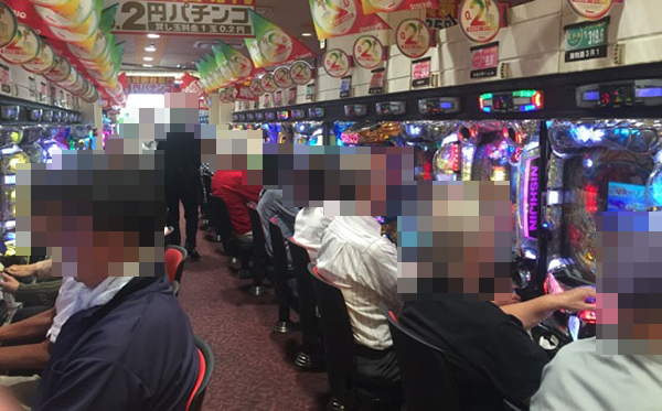 0.2円パチンコで遊技を楽しんでいるプレイヤーも多く、空席はほとんど見当たらない。