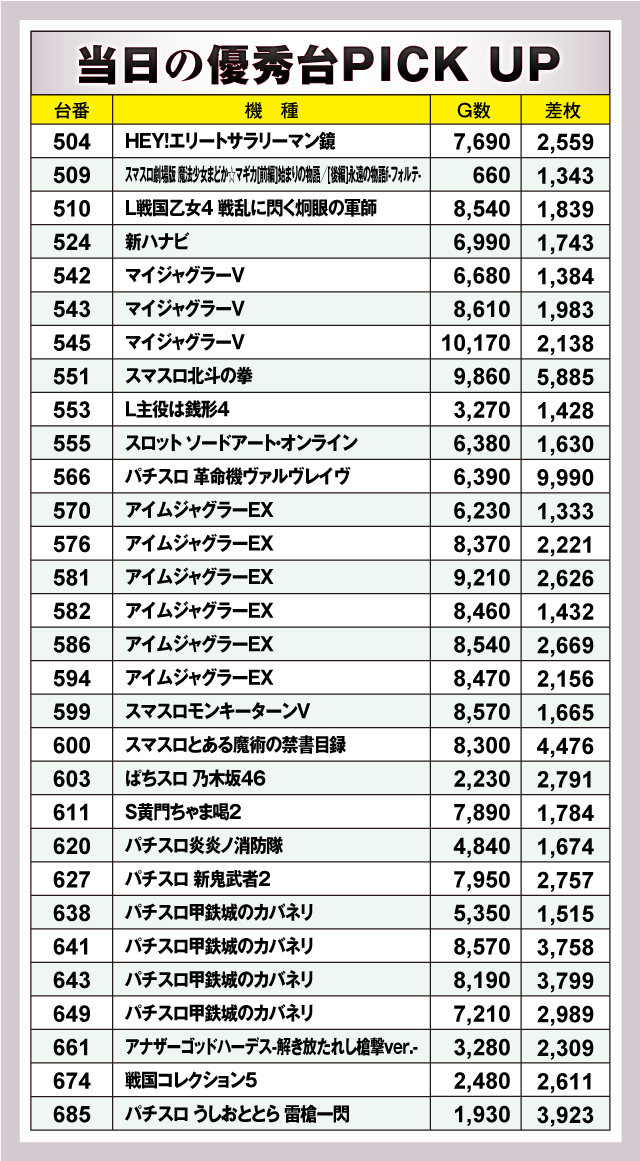 まずは優秀台全30台のピックアップから。30台のうち17台が+2,000枚オーバーで、+3,000枚オーバーは6台出現! そのなかでもっとも活躍していたのは、566番台の「パチスロ 革命機ヴァルヴレイヴ」で差枚+9,990枚をマーク! また30台全体を見渡すと、スマスロが大部分を占めるなか、ジャグラーシリーズの活躍が目立っており、30台のうち9台がランクイン。ハイスペック機種からノーマルタイプまで幅広い機種にチャンスが隠されていたようだ!