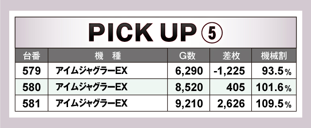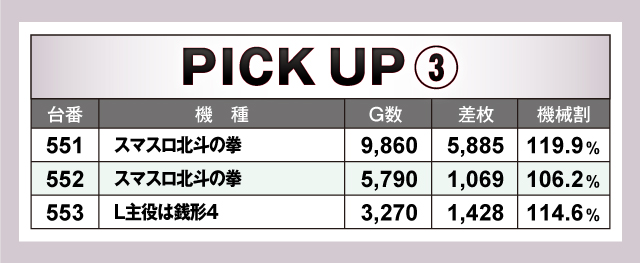 続いては、並びで活躍していた7箇所を紹介。7箇所すべての並びがトータルプラス終了しており、そのうち4箇所が平均+1,000枚オーバー! なかでも551番台〜553番台の「スマスロ北斗の拳」「L主役は銭形4」の3台並びは、3台全てがプラスの平均+2,794枚で7箇所の並びの中でもっとも優秀だった! その他の並びにも良台を多数確認できたので、同店で遊ぶ際は並びに注目して立ち回ってみよう!