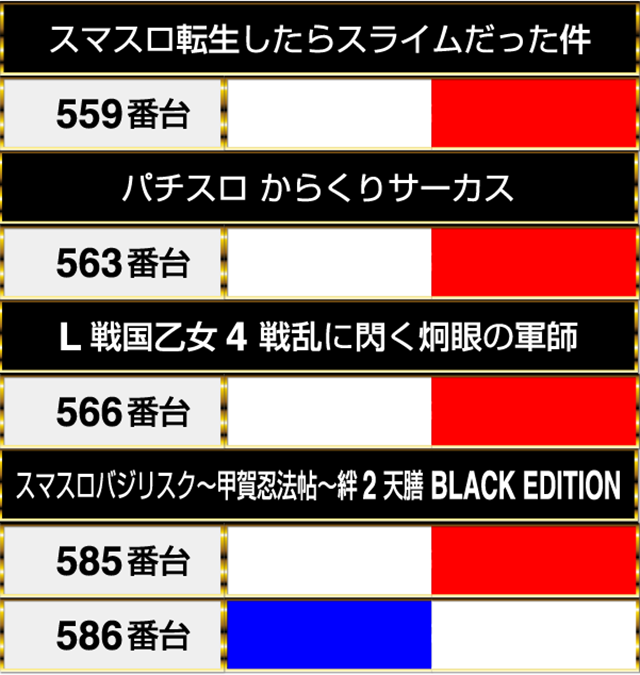 『L戦国乙女4 戦乱に閃く炯眼の軍師』の566番台や『スマスロバジリスク~甲賀忍法帖~絆2 天膳 BLACK EDITION』の585番台などもプラスpt。