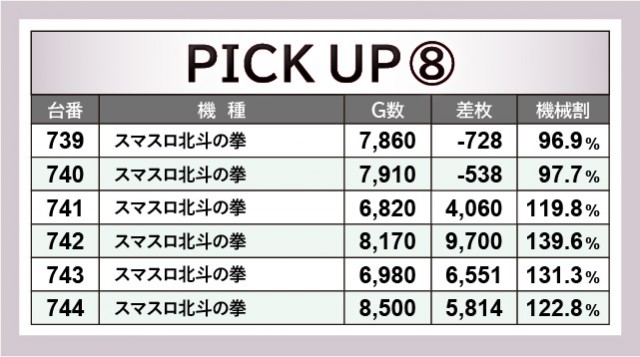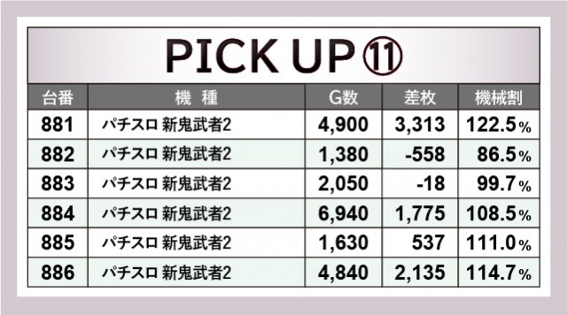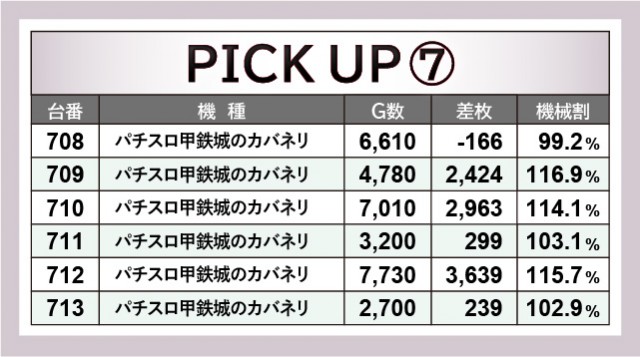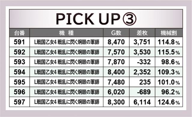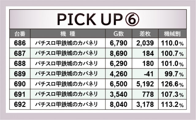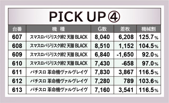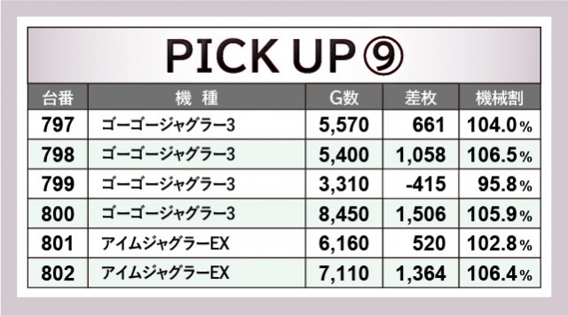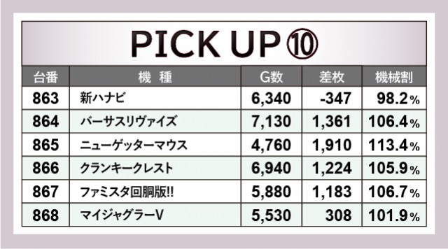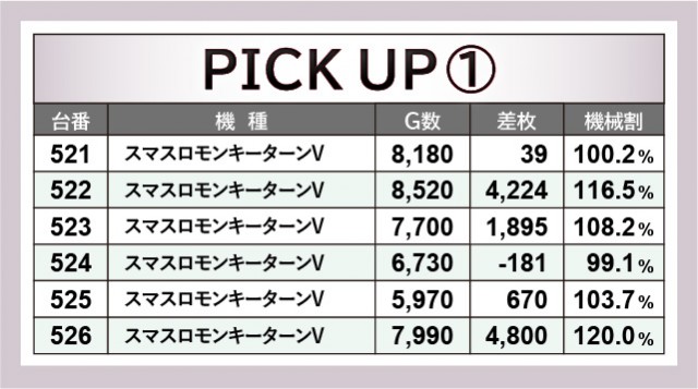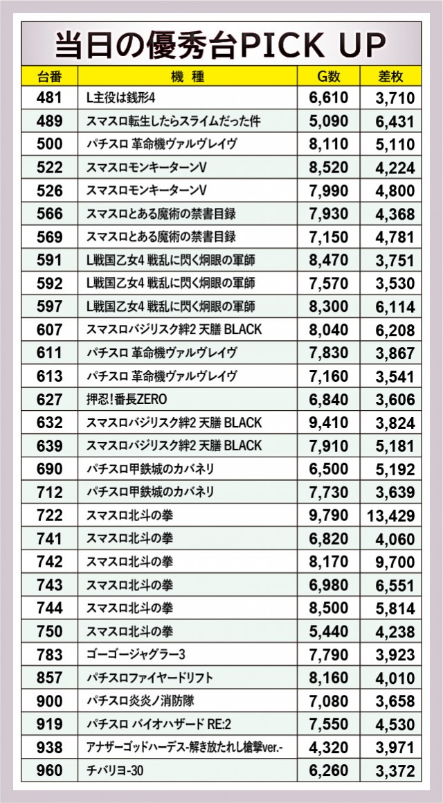 ノーマル機群も活気が溢れており、上記の機種は高い回転数をマーク。突出した出玉こそ見られないが、安定したパフォーマンスを披露したことにより、安心して遊技できたのではないだろうか。大きなマイナスになっていない点からも、ファンが大きな手応えを感じながらレバーを叩いていた様子が窺える。