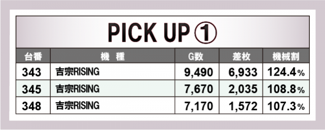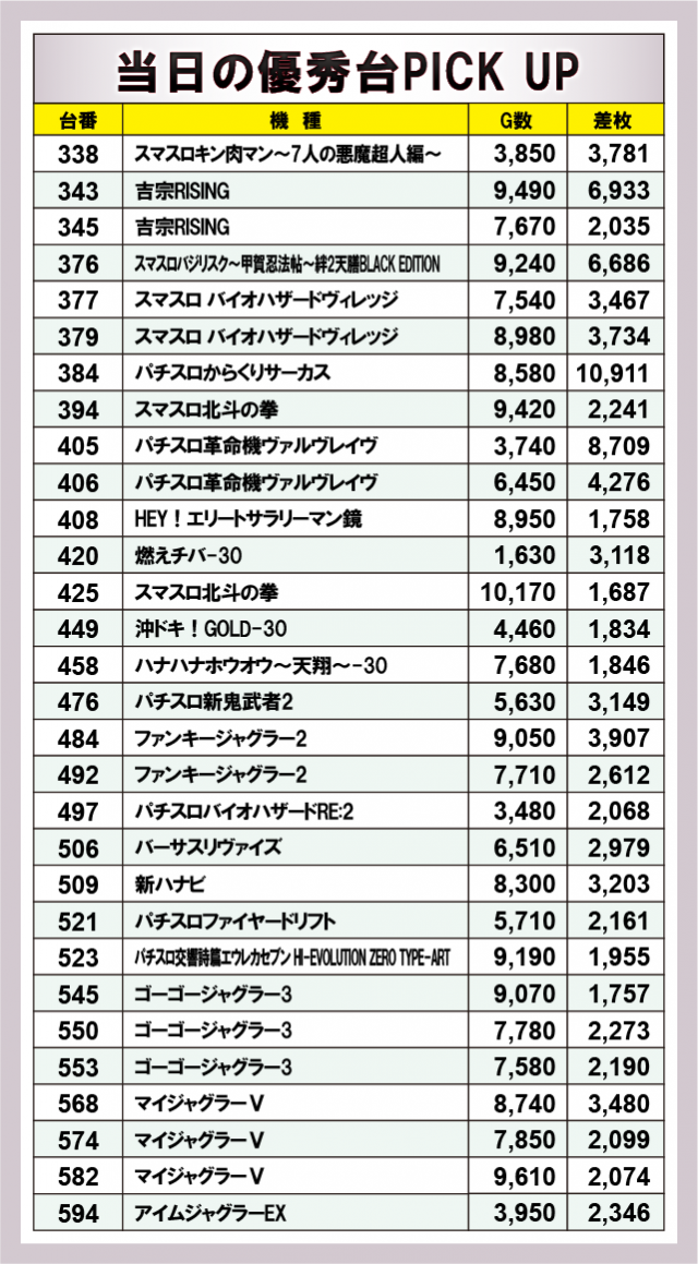 上表を見ると、384番台『パチスロからくりサーカス』で+10,911枚と万枚OVERが発生し、遊技していたファンもご満悦だったことだろう。ほかにも405番台『パチスロ革命機ヴァルヴレイヴ』で+8,709枚や、343番台『吉宗RISING』で+6,933枚と、376番台『スマスロバジリスク~甲賀忍法帖~絆2天膳BLACK EDITION』+6,686枚といった大台突破台も確認でき、様々な機種がポテンシャルを発揮し、打ちごたえのある状況だったと言える。