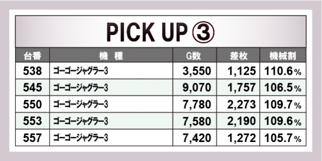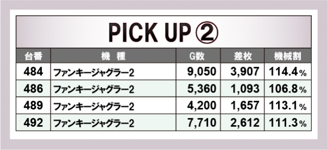 続いては、この日の好調3機種をみていこう。『吉宗RISING』343番台+6,933枚や『ファンキージャグラー2』484番台+3,907枚、『ゴーゴージャグラー3』550番台+2,273枚・553番台+2,190枚など好感触な記録が目立ち、ファンはレバーオンをする力が強くなっていったはずだ。回転数からも察することができるが、相当な手応えを感じられ、同店の初戦を大きく盛り上げてくれたと言えよう。