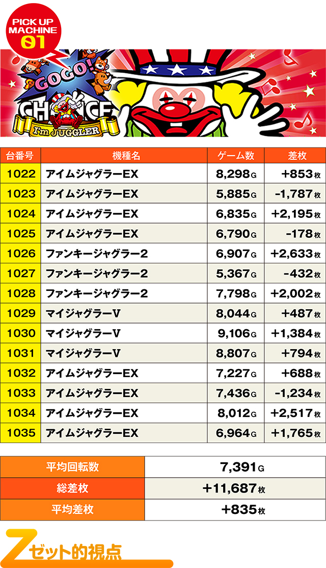 『ジャグラー』シリーズから優秀台を思わせる好結果が続出。プラっていた台のボーナス合算値を見るに、優秀台が多く潜んでいたのは間違いないようだ。