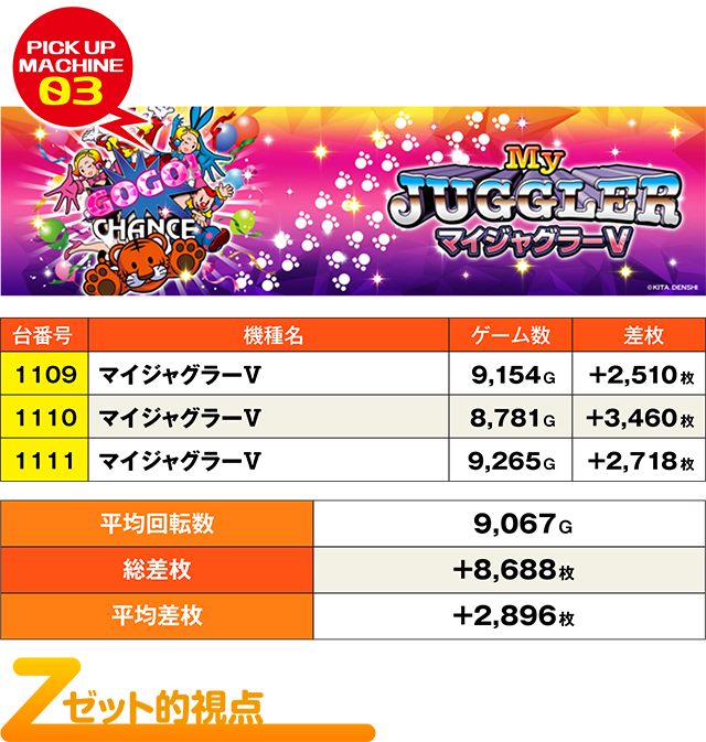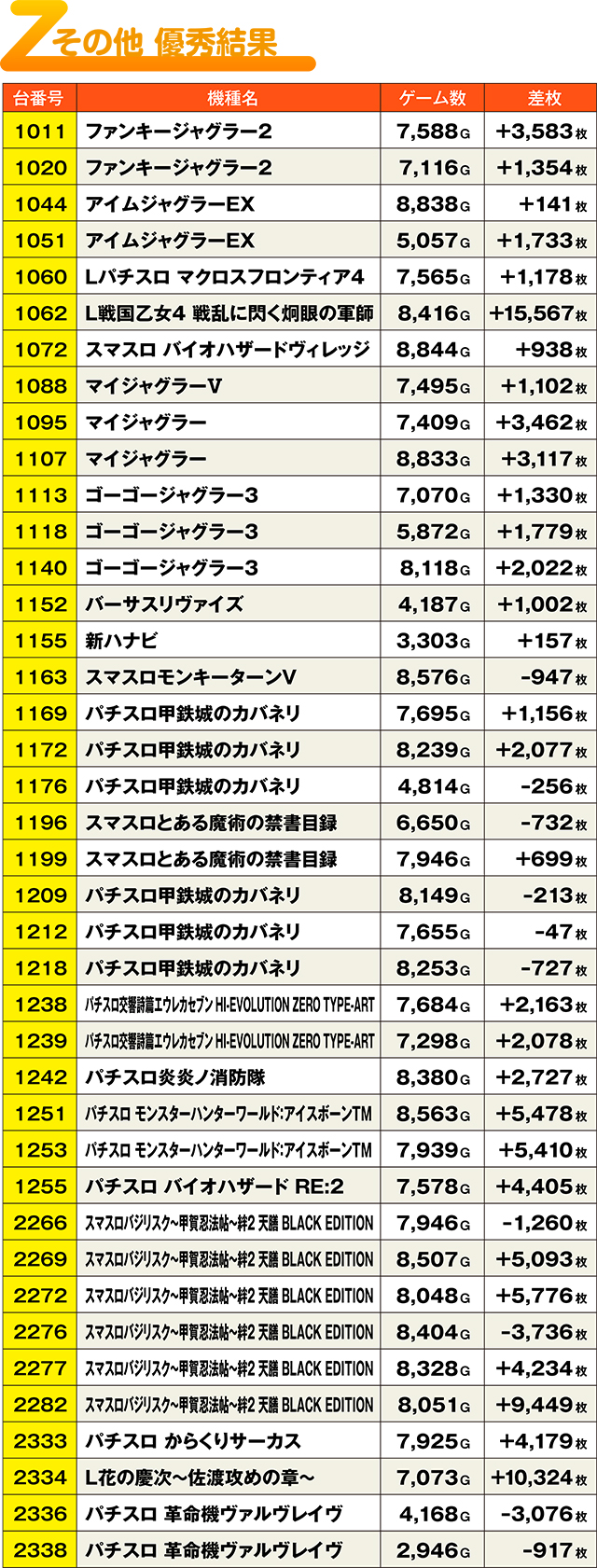 AT機顔負けの好結果を叩き出し、優秀台を確信させてくれたのは『マイジャグラーⅤ』。3台ともが+2,500枚超えとは驚きを隠せない。