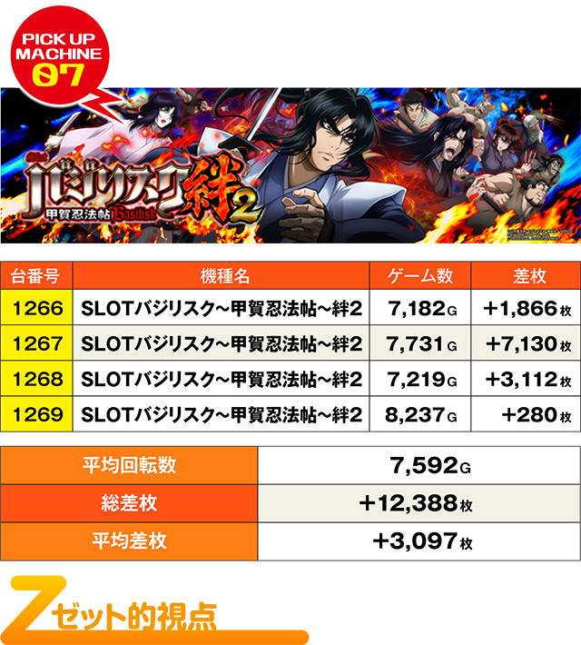 4台設置の『SLOTバジリスク~甲賀忍法帖~絆2』は、4台ともがプラス値をマーク!1267番台が7,000枚オーバーを達成し、4台の平均は+3,097枚!
