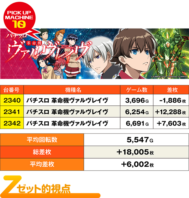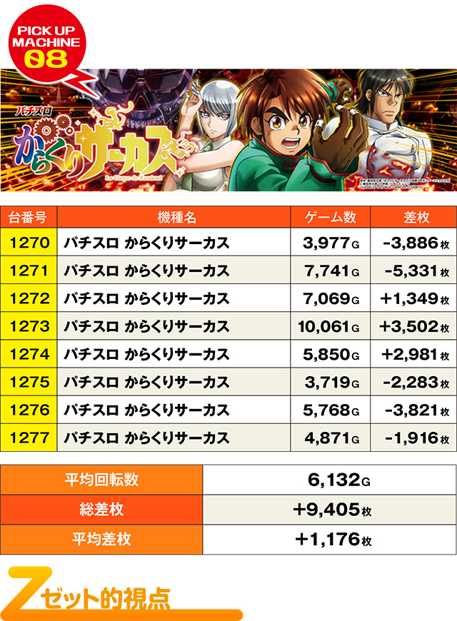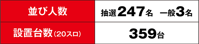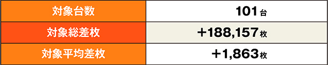 8台並びで大当りを量産していたが、結果は両極端なものに…。3,000枚オーバー記録が生まれた反面、マイナス台も目立つ結果となってしまった。