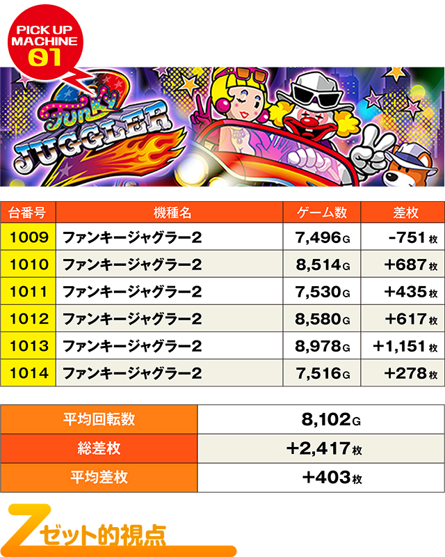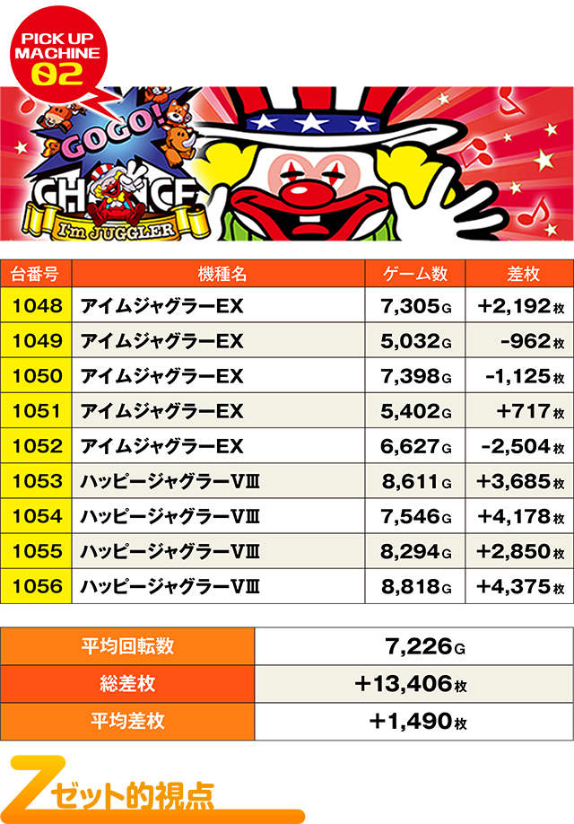 6台並びでGOGOランプを光らせまくっていた『ファンキージャグラー2』。3,000枚オーバーこそ生まれなかったものの、6/7台がしっかりプラっていたのは優秀台の証!?