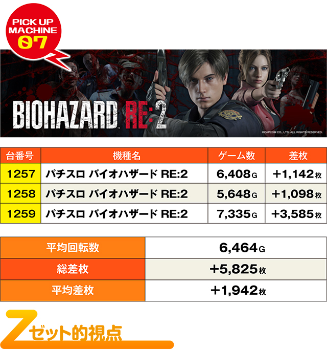 6台設置の『パチスロ バイオハザード RE:2』だが、半数にあたる3台が並びっぽい挙動を披露。3台ともがきっちりプラス差枚となっていた。