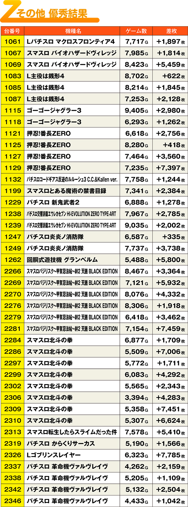 3,000枚オーバーが計17台も出現。さらに細分化すると5,000枚超えが10台、7,000枚超えが5台(!)と、凄まじい記録まみれだった1月25日。『押忍!番長ZERO』『スマスロバジリスク~甲賀忍法帖~絆2 天膳 BLACK EDITION』『スマスロ北斗の拳』『パチスロ 革命機ヴァルヴレイヴ』などの人気マシンは優秀台潜伏率が高かったようだ。
