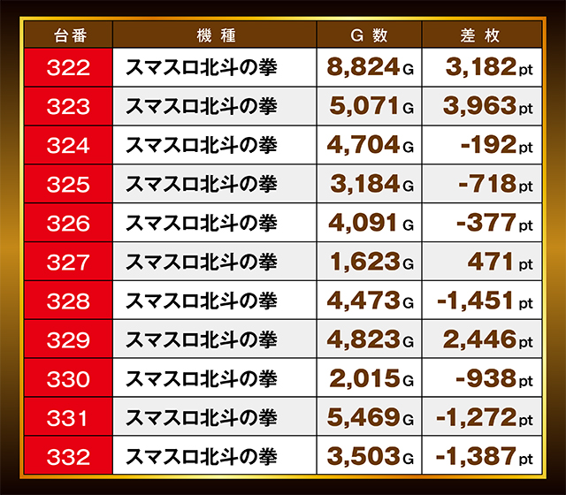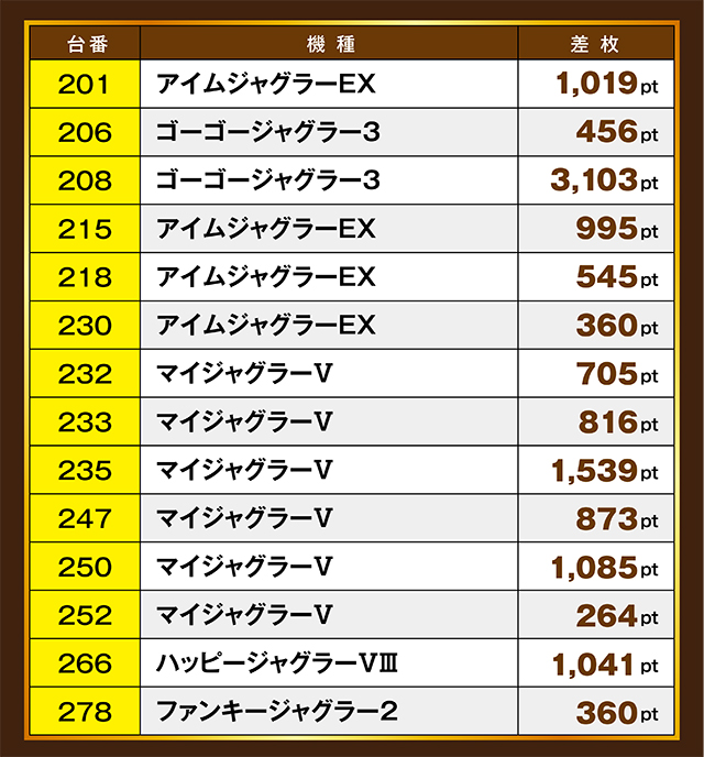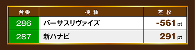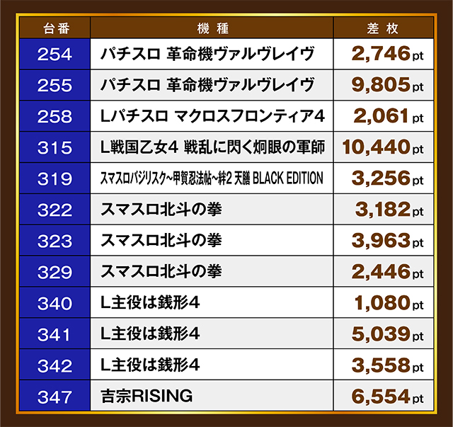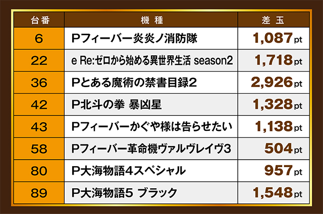 今回の「ウエスタン一之江店」の結果は五カ国制圧。六カ国すべてで好結果が生まれていたものの、「英彩ノ国」で1台だけマイナス台が出てしまい、全国制圧を逃すこととなった。しかし「須磨ノ国」の結果には目をみはるものがあり、特に9,800pt超えを果たした『パチスロ 革命機ヴァルヴレイヴ』、10,000ptオーバーを達成した『L戦国乙女4 戦乱に閃く炯眼の軍師』など大きな爪痕を残すことに成功した。この様子ならば次回全国制圧も十分狙えそうだ。
