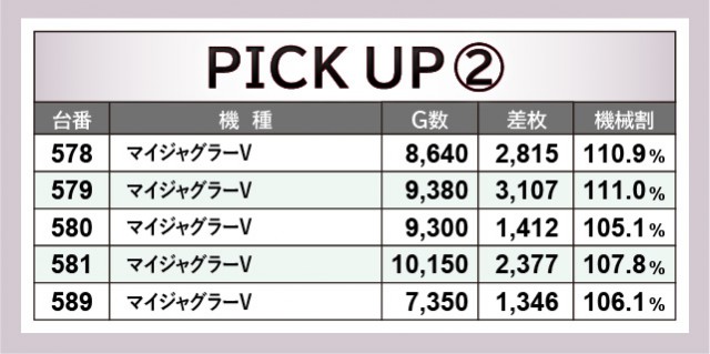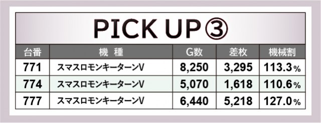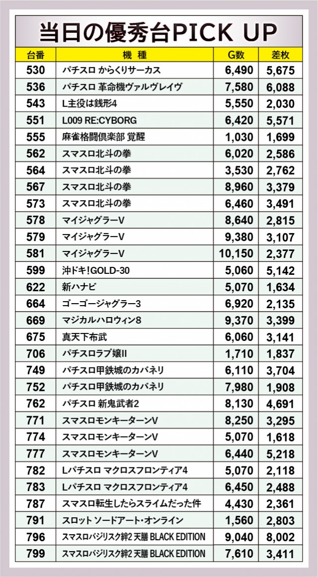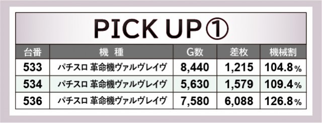 『マイジャグラーⅤ』は朝から閉店までじっくりと打ち込まれ、9千回転台や万回転OVERが発生。コンスタントなボーナス当選で2~3千枚OVERも獲得しているのが目に焼きつくばかりだ。そして『パチスロ 革命機ヴァルヴレイヴ』536番台+6,088枚や『スマスロモンキーターンV』777番台+5,218枚と大きな熱気を放っていたのも見逃せず、同機種らの今後の活躍が見逃せない。