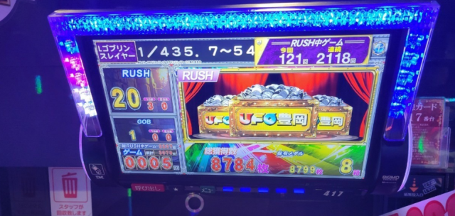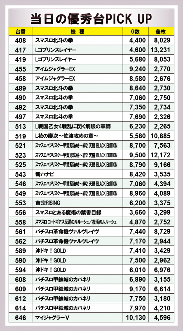 上表の優秀30台をみると、『マイジャグラーⅤ』646番台にて万回転OVERが発生。さらに、『Lゴブリンスレイヤー』で417番台+13,231枚、『スマスロバジリスク~甲賀忍法帖~絆2 天膳 BLACK EDITION』で523番台+12,172枚、『L花の慶次~佐渡攻めの章〜』で519番台+10,885枚と3台の万枚OVERをマーク。スマスロ勢の圧倒的存在感を存分に示し、店内は大きく盛り上がっていた。