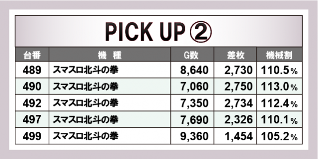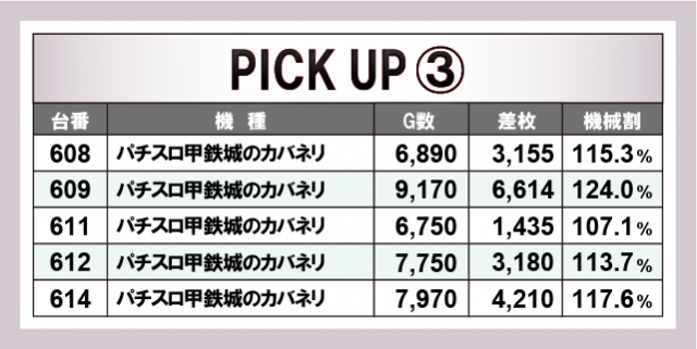 『アイムジャグラーEX』は朝から閉店までじっくりと打ち込まれ、9千回転台が発生。コンスタントなボーナス当選で2千枚OVERも獲得しているのが目に焼きつくばかりだ。次いで、『スマスロ北斗の拳』では、5台の平均差枚数が+2,398枚と打ちごたえのある状況となっていたようだ。そして、『パチスロ甲鉄城のカバネリ』では、609番台+6,614枚を筆頭に5台のトータル差枚数は+1万8千枚OVERを記録し、まだまだ注目の機種なのは確かだ。