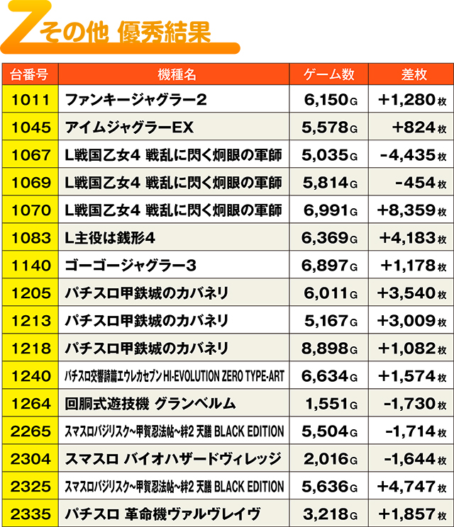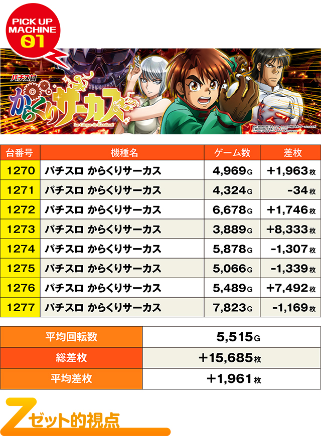 圧倒的な強さを見せつけた『パチスロ からくりサーカス』。8台並びの中から7,000枚オーバー記録が2台も誕生していたのである。