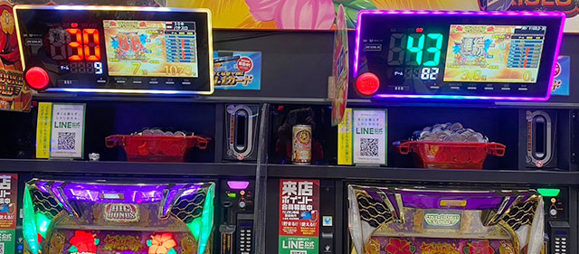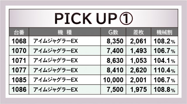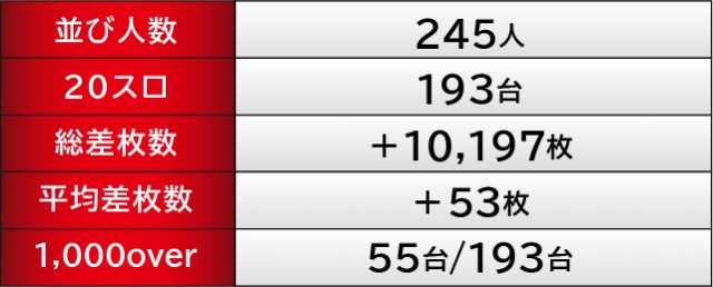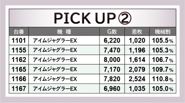 突出した出玉でアピールするのも良いだろう。しかし『アイムジャグラーEX』は安定感のあるパフォーマンスで魅了し、当日は多くの台で終日まで打ち込まれた台を確認できた。1077番台+2,620枚や1166番台+2,524枚など、まとまった出玉を獲得できたファンは口角を緩めていたに違いない。島は高い活気と熱気に包まれ、誰もが力強くレバーを叩いては、GOGOランプの輝きに癒されていたことだろう。