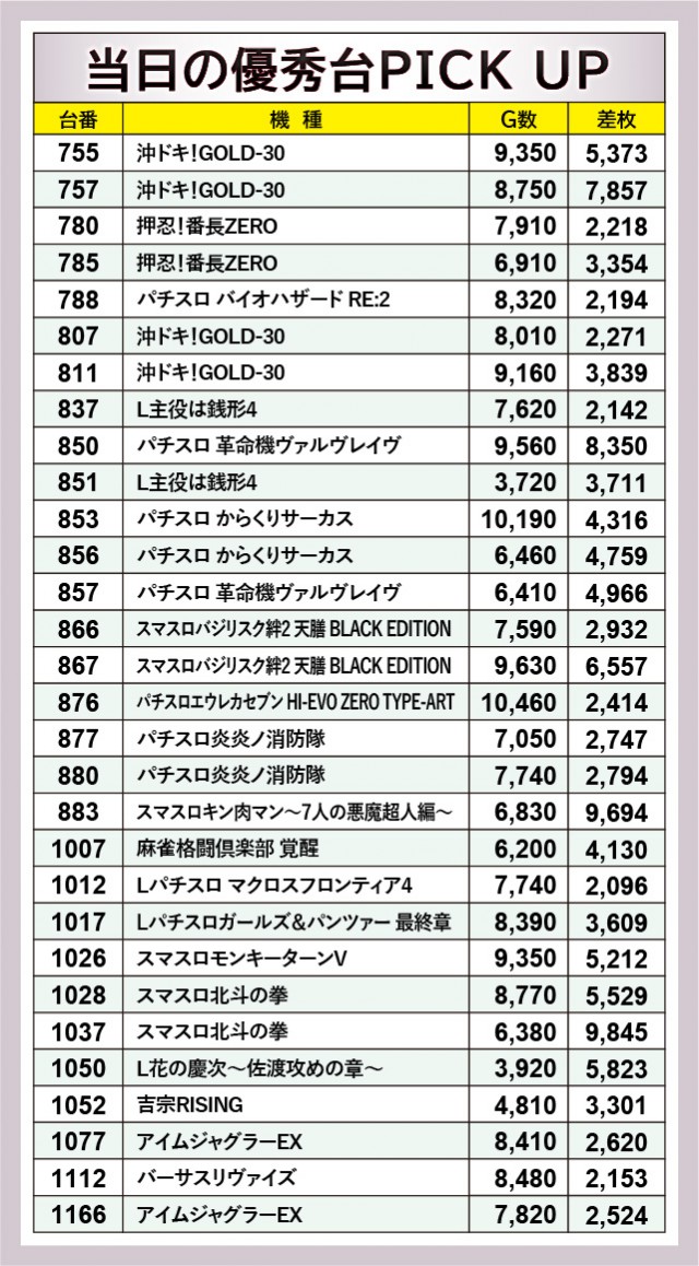 『スマスロキン肉マン~7人の悪魔超人編~』883番台+9,694枚・『スマスロ北斗の拳』1037番台+9,845枚と、当日は2台の9千枚OVERが発生。さらには『パチスロ 革命機ヴァルヴレイヴ』850番台+8,350枚という数字も確認でき、店内は大きな熱気に包まれていたと言えよう。また2枚の万回転OVERも見られ、各所で相当な手応えを感じられたに違いない。