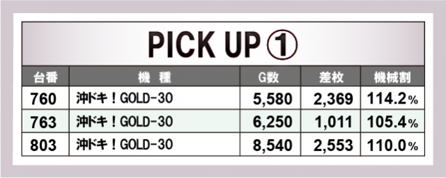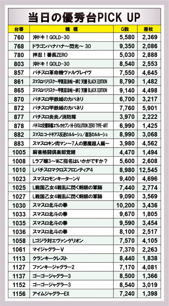 まずは優秀30台のPICK UPから。30台のうち23台が+2千枚オーバーを達成、+3千枚オーバーが14台、+4千枚オーバーが8台となった。その中でも、+12,545枚を記録した1010番台『Lパチスロマクロスフロンティア4』が輝く。ポテンシャルを存分にいかし、実力をいかんなく発揮してくれた。これに続いたのが、根強い人気をもつ872番台の『パチスロ甲鉄城のカバネリ』で+5,901枚をマーク。さらに『スマスロモンキーターンV』『パチスロ革命機ヴァルヴレイヴ』『スマスロキン肉マン~7人の悪魔超人編~』など、人気のスマスロ勢を筆頭に多くの機種が光っていた。