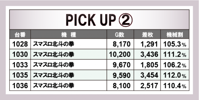 続いてはこの日の好調2機種をチェック。まず、『沖ドキ!GOLD-30』では、+2千枚オーバーが2台出現し、3台のトータル差枚数は+6千枚オーバーを記録。次いで、『スマスロ北斗の拳』では、万回転OVERが発生する好状況だった様子。回転数の多さから手ごたえのほどを窺うことができ、結果として+3千枚オーバーが2台発生し、5台のトータル差枚数は+1万2千枚オーバーをマークした。両機種から大きな熱気が放たれており、それぞれが実力を存分に実感する内容となっている。