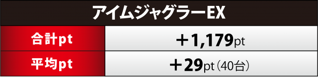 『マイジャグ』20台は+8千を超える合計ptで終了。プラス台の割合は55%(11台)と『ゴージャグ』には及ばなかったが、1,000overは7台とこちらでは上回り、+2千超が3台見受けられた。