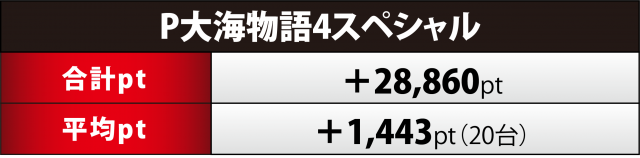 『大海4 SP』20台は+2万9千弱のトータルプラス&4桁の平均ptで終えた。こちらもプラスは9台と全体の半分弱、+1万オーバーは5台となった。