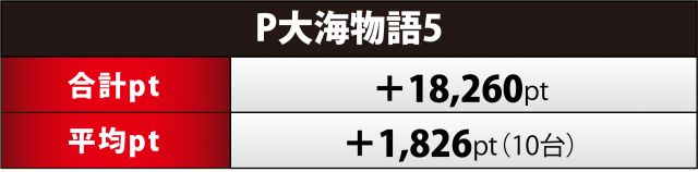 『大海5』10台も合計ptでプラスを成立。プラス台割合は60%(6台)と今回のトップと同等となり、5桁プラスが3台、こちらも決して悪くない状況だったと推測される。