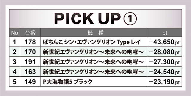 2024年1月中旬時点で同店のメインを張っているのは『P大海物語5 ブラック』『新世紀エヴァンゲリオン~未来への咆哮~』『P大海物語4スペシャル』『P大海物語5』『ぱちんこ シン・エヴァンゲリオン Type レイ』の5機種となる。
