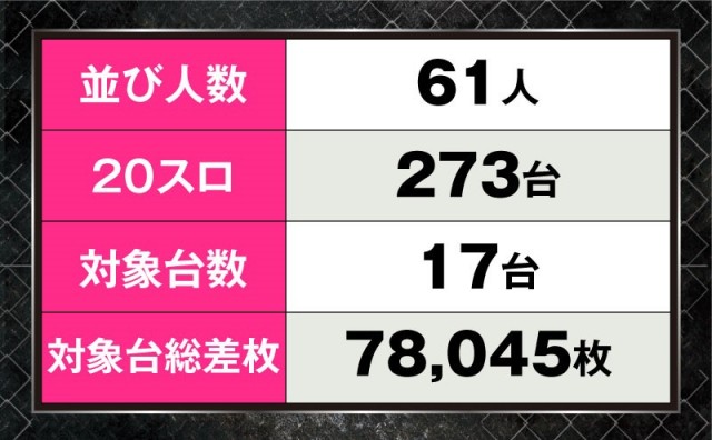 今回注目すべきは、なんと言っても好調台全台の差枚!!17台で合計+78,045枚、1台平均+4,590枚と歴史的な記録を叩き出している。