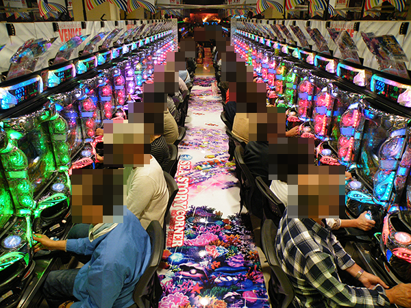 1円パチンコもほぼ満席といった状況。コーナー全体の雰囲気が明るく、大きな活気が感じられる空間となっていた。
