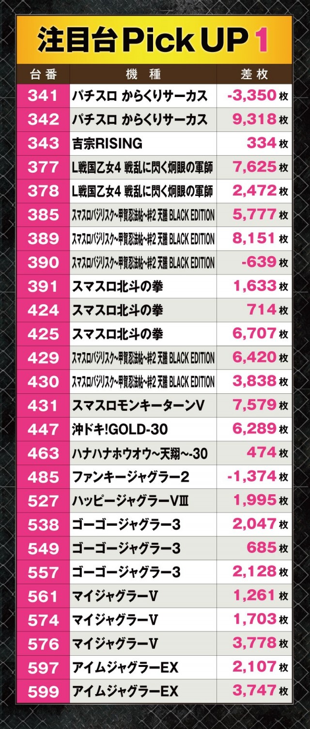 それだけではない。ジャグラーシリーズからは10台好調台が誕生しており、ほとんどの台が1,000枚以上のプラスとなっていた。