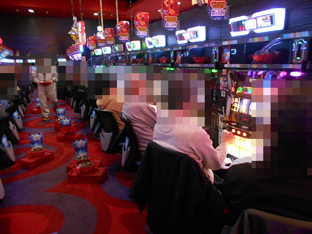 14時過ぎの「沖ドキ!GOLD-30」は、設置されている11台がすべて埋まっており、全員が1箱以上の持ち玉を使って遊技をおこなっていた。